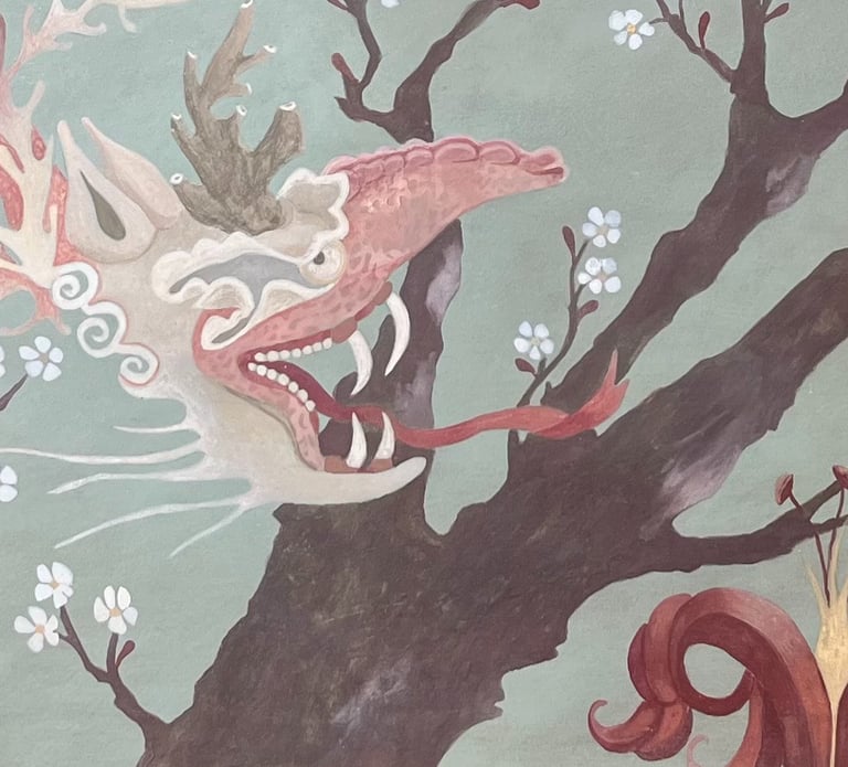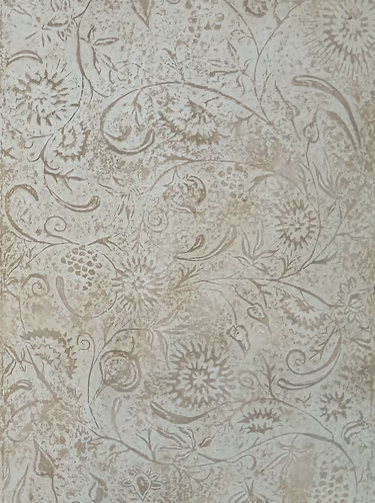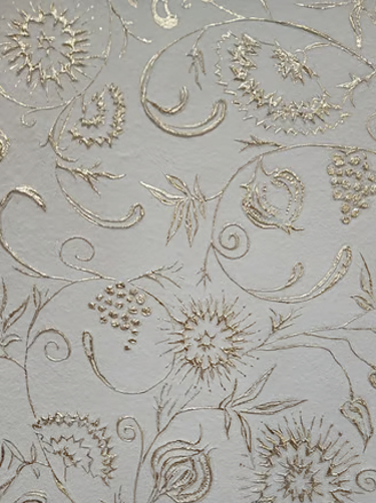 Nous utilisons des liants et des charges naturelles comme la peinture à la caséine, à l'huile, la gouache et l'aquarelle, la colle de peau, le badigeon. Feuilles d'or ou de cuivre peuvent agrémenter nos décors.